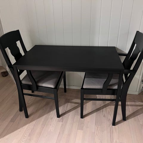 Selger meget pent brukt sort Sandsberg kjøkkenbord fra IKEA, samt 3 stk sorte Stefan stoler også fra IKEA.