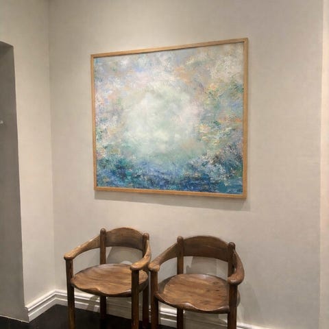 Bildet er bygget opp i flere lag med struktur og transparens. Fargene beveger seg mellom blåtoner, rosa og varme nyanser, og uttrykket endrer seg med lyset i rommet.