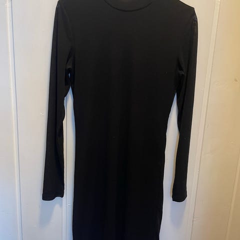 Kjolen er svart og laget av viskose. Modellen har lange ermer og V-hals. Stoffet er ribbestrikket for en tettsittende passform. Egnet som enkel hverdagskjole som kan brukes alene eller kombineres med ulike lag.