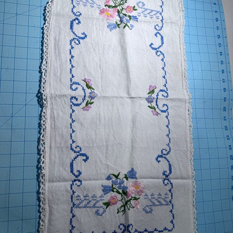 Vintage pyntehåndkle – blått nostalgisk broderi – ca 58 x116 cm (dbl lengde)