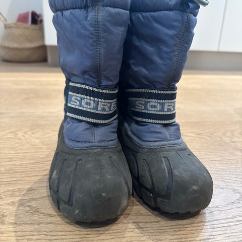 Sorel vinterstøvler for barn i størrelse 31, unisexmodell. Støvlene er svarte med kraftig gummisåle med grovt mønster for godt grep. Overdelen er i tekstil med snøring og justering øverst. Modellen har uttakbar innerstøvel/innersokk for ekstra isolasjon og enklere tørking. Egnet som varme og vanntette vinterstøvler til bruk i snø og kaldt vær.