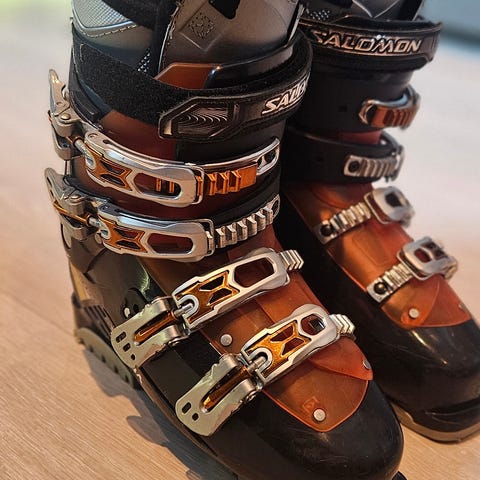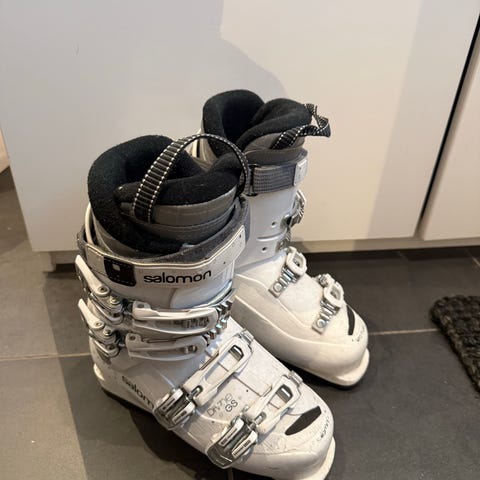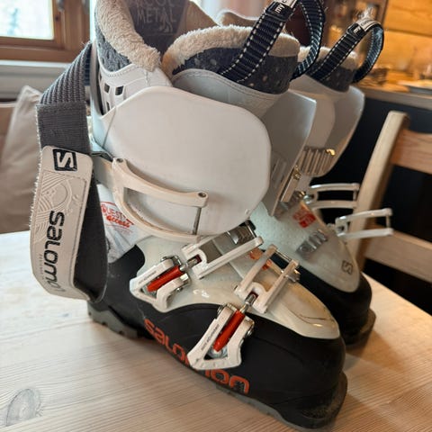 Salomon alpinstøvler i størrelse 25.5. Støvlene er i hovedsak hvite med grå og blå detaljer. Modellen har fire justerbare spenner i metall og powerstrap øverst for bedre tilpasning rundt leggen. Myk, polstret innerstøvel gir komfort og støtte. Passer til alpinbruk i bakke for voksne eller større ungdommer som trenger støvler i størrelse 25.5.