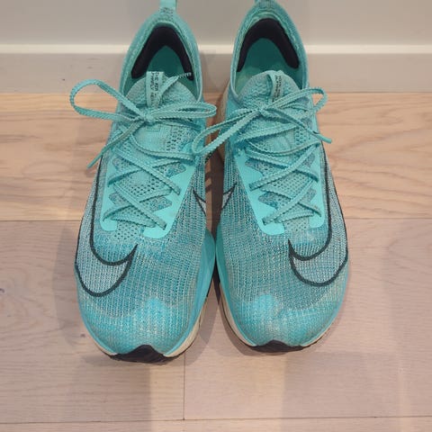Nike Alphafly 1 i størrelse 44,5. Kjøpt brukt, var løpt ca 200km, har brukt de 20km mer, men de passet meg ikke helt. Er i helt fin stand, masse kilometer igjen!