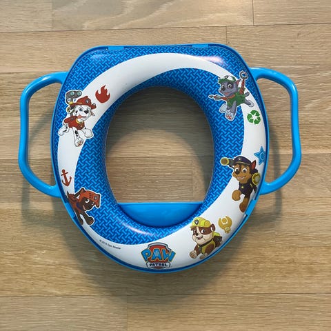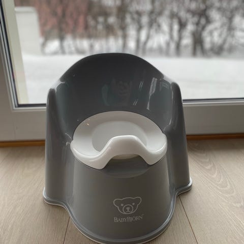 Barnetreningspotte utformet som et lite toalett, med lokk som kan åpnes og lukkes. Innerskålen kan tas ut for enkel tømming og rengjøring.