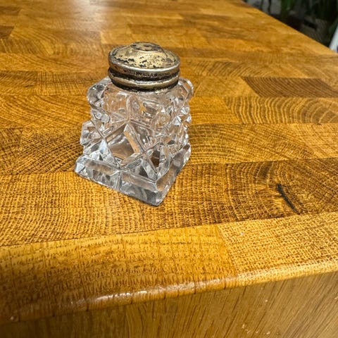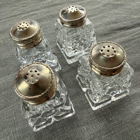 Selger et nydelig sett med fire vintage salt- og pepperstrøere. Glassene har et dekorativt, klassisk mønster, og alle korkene er merket STERLING, altså ekte sølv. Dette er typiske amerikanske strøere fra ca. 1920–1950.