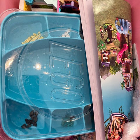 LEGO Friends byggesett. Inneholder en sportsarena med tribune, inngangsparti og lekeområder, samt mindre bygninger som kiosk og ulike aktivitetsstasjoner. Settet består av fargerike klosser i blant annet hvitt, blått, rosa og grønt. Passer til lek med sportstema og rollelek i LEGO Friends-universet.