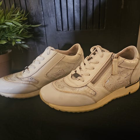 Hvite sneakers i skinn fra Caprice str 39 med fine sølv detaljer. Noe brukt men mye bruk igjen