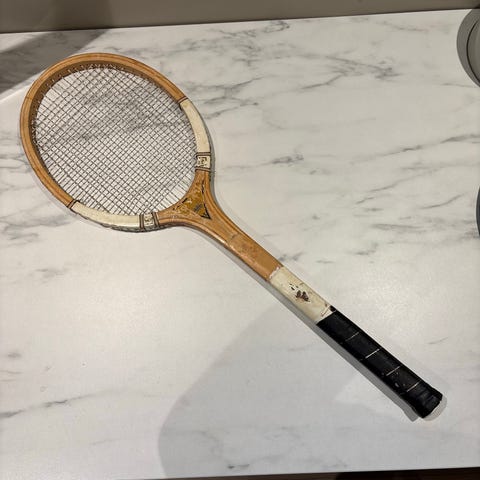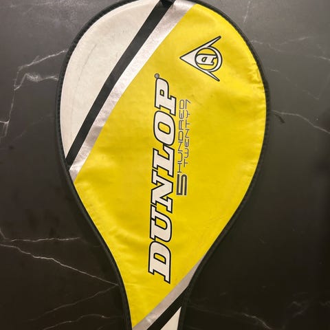 Dunlop tennisracket i tre med svart og naturfarget finish. Klassisk ramme med strenget hode og tradisjonelt håndtak i tre. Egner seg som bruksgjenstand eller som dekorativt samleobjekt for tennisutstyr. (Powermaster)
