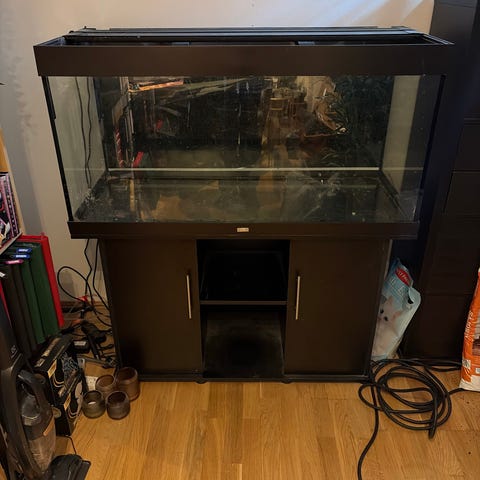 78 cm på rettsidene... 142 cm i bue glasset. Enten 300 el 350 liter. Ny vasket og ren. Stor plass i skapet under