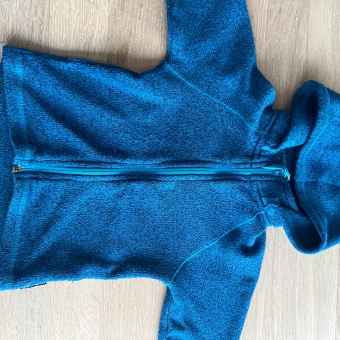 Polarn O. Pyret fleecejakke for barn i størrelse 92. Jakken er unisex og i gul/grønn fleece. Den har glidelås foran og høy krage. Egnet som mellomlag eller lett jakke i overgangssesonger.