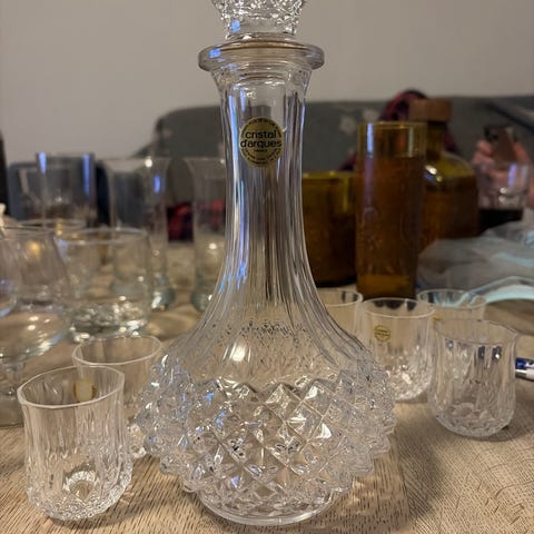 Selger en elegant Cristal d’Arques (France) krystallkaraffel. Den har et klassisk og tidløst design med vakre slipte detaljer, og dekorativ vifteformet propp. Anslås å være fra 1970-90-tallet. Det originale klistremerket viser at den er av ekte fransk krystall (24 % blykrystall). 😊