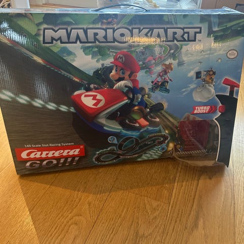 Super Mario Mario Kart bilbane på 2,4 meter kommer med to biler. Funker som den skal. Elektrisk racerbane og to små biler med Mario og Yoshi-figurer. Banen kommer batterier og håndkontrollere. Egnet som lekesett for barn som liker Super Mario og bilbaner.