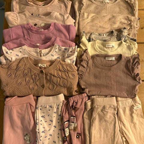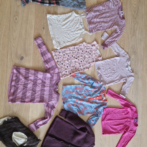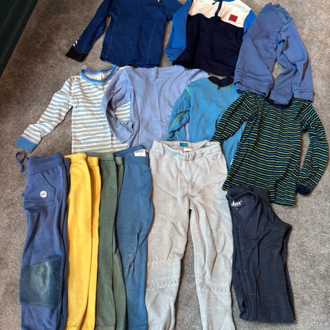 Tre sett. To bambus-sett. Tre overdeler. 6 par med ullsokker. Overdelene er genser (ikke body).