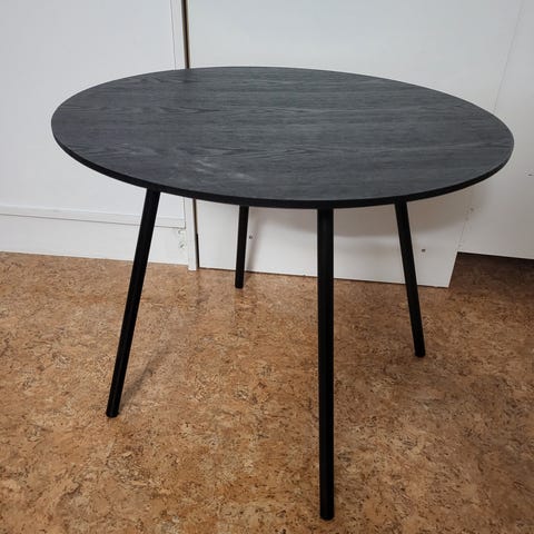 Røa rundt spisebord Ø120, svart lakkert eikefiner inkludert 1 ileggsplate (utvides til 120x165), med svarte stålben.