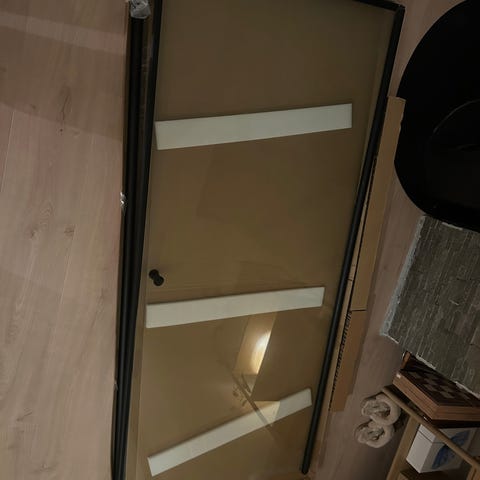 Dusjdør selges. Mål 70x186. Glasset er ikke knust men foliert. Pris kan diskuteres. Må hentes.