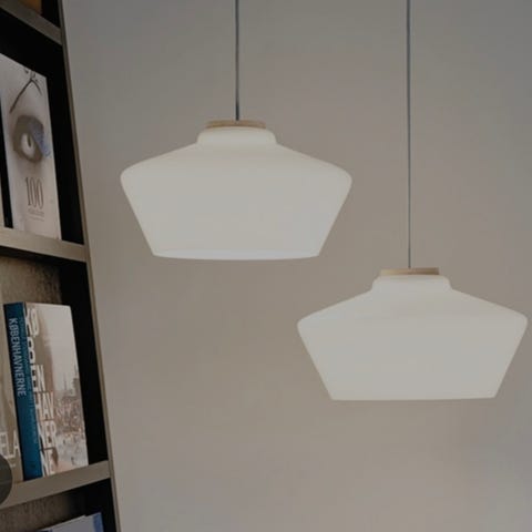 «Lampen har en glatt, hvit skjerm med en diameter på 40 cm og en høyde på 1100 mm inkludert oppheng. Øverst på skjermen finner du en dekorativ tre-detalj som gir et varmt og nordisk preg, og som harmonerer godt med både moderne og klassiske interiørstiler.