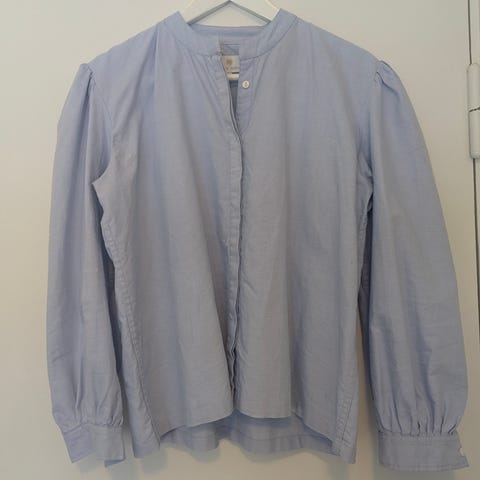 Hampton Republic 27 bluse for dame i størrelse 40. Blusen er blå med smale vertikale striper og er laget av bomull. Modellen har rund hals, trekvart til lange puffede ermer med strikk nederst og lett buet nederkant. Lukkes med knapp i nakken. Passer til hverdagsbruk eller mer pyntede anledninger sammen med bukse eller skjørt.