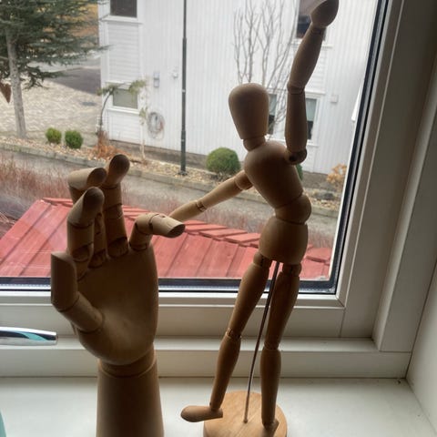 Tegnedukke modellfigur i tre. Dukken står på rund fot og har bevegelige ledd i armer, ben og overkropp, egnet som referansefigur til tegning, maling og andre kreative prosjekter. Nøytral treoverflate gjør det enkelt å se proporsjoner og poseringer.