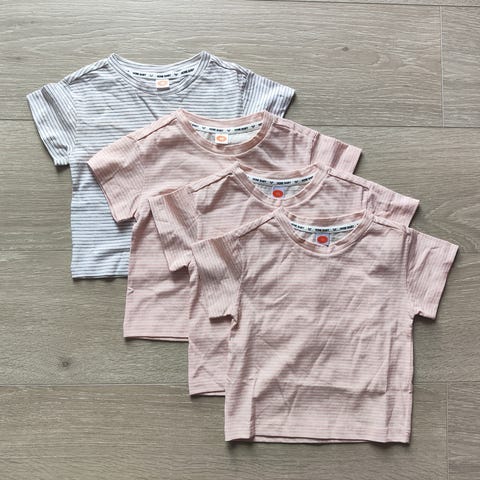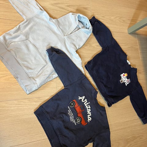 Genserpakke str 80. 2 genser, 1 fin og tynn genser med sløyfe (lite brukt) og en hettejakke. Hello Kitty er litt gulnet trykket og mistet litt glitter på noen av snøflakene. Den hvite genseren har litt rar hals. Den ser revnet ut, men var slik i butikken når vi kjøpte den så regner med at det skal være slik