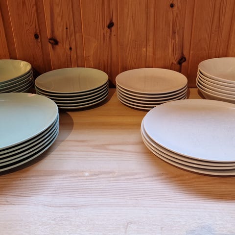 Selger sett med flate tallerkner og boller i matchende grå farge. Delene er laget i keramikk/steingods. Noen av tingene har en liten skade/avskalling på kanten, som vises på bildet. Egnet til servering av middag, frokost eller snacks. Alt er fra IKEA og arvet da det var tid for utflytting. Selges samlet og kan IKKE sendes! Kan møtes mellom Raufoss- Fredrikstad ( ikke oslo sentrum)