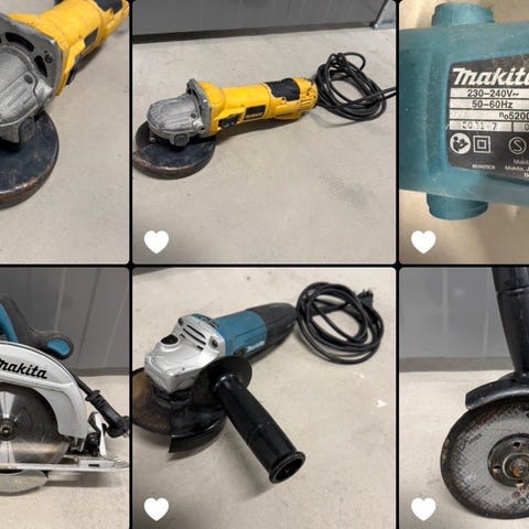 Dewalt dykkertpistol brukt i ca 3 dager til sammen etter husbygging (så godt som nytt) makita håndsirkelsag godt brukt og fungerer godt ,har aldri hatt noe problem med begge verktøyene
