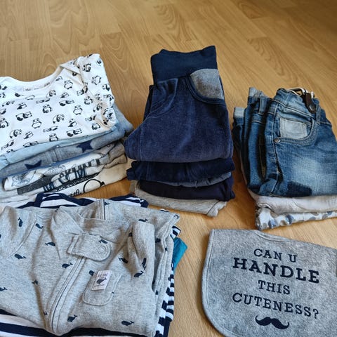 Klespakke 23 body + 10 bukse str 74 (2 plagg 74/80. En body i str 68, men lang. En bukse str 80, men liten). Selges billig da det forekommer flekker på flere plagg (noe mindre og noe større) og jeg ikke har mulighet til å se gjennom alt av flekker. Finnes flere plagg uten flekker også. Fant kun 1 rift/hull ved rask gjennomgang. Ser ikke bort fra at jeg kan ha oversett noe. Mye klær for pengene. Legger ved bilde av noen av flekkene for å vise litt. Merker som newbie, name it, hust & claire, hm, Lindex, KappAhl, lilleba