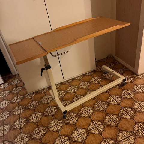 Simple little desk suitable for laptop. 60cm to 90cm height adjustable. New but too big for me.