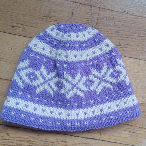 Lue strikket i fanamønser. Kan sendes for 69.-