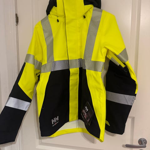 Jakken har hette og flere refleksbånd rundt kropp og ermer for bedre synlighet i omgivelser med lite lys.