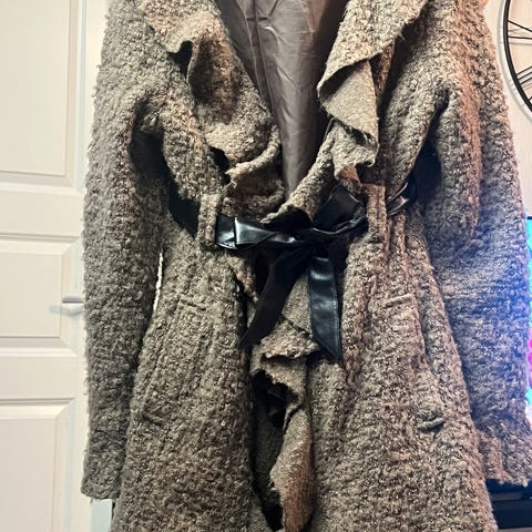 Vintage brun kåpe eller strikkejakke fra merket Donna. Plagget kjennetegnes av en teksturert overflate, volangkant langs åpningen foran og nederst, samt et medfølgende