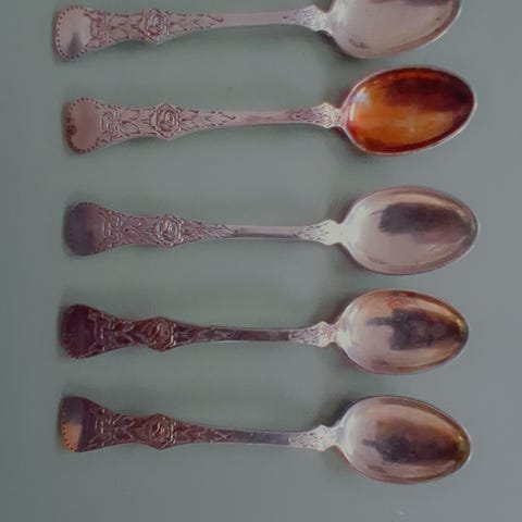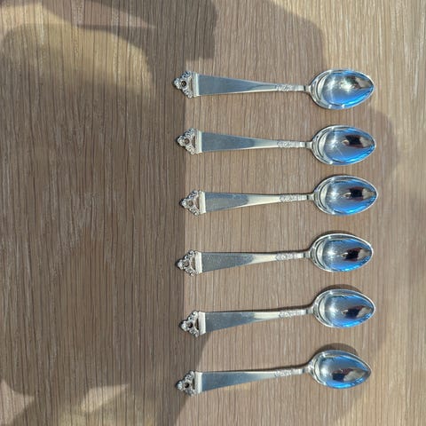 "Flat Rose", sett med 6 teskjeer i sølvplett. 40 gram. Gi bud :)