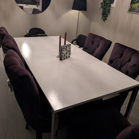 Spisestue sett spisebord med marmormønstret bordplate og 6 polstrede stoler