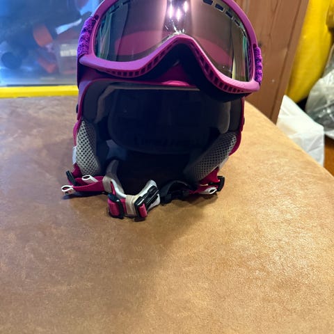 Fin hjelm for barn, lite brukt og aldri slått i bakken. Følger med ski briller som vist på bilde
