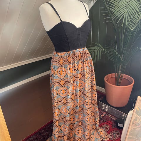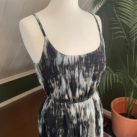 Løs og ledig maxikjole med belte i livet. Størrelse small, men er oversized så passer medium og sikkert også large.