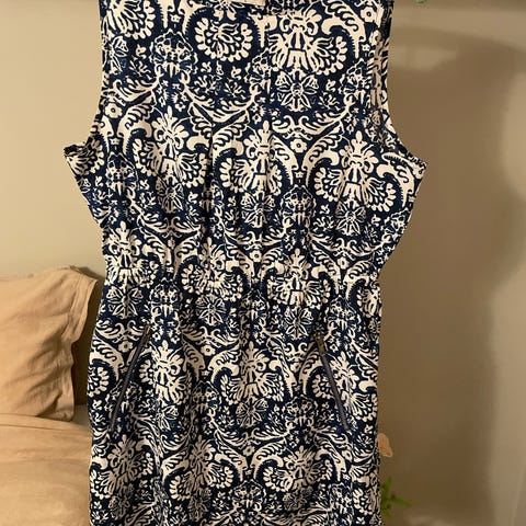 Indiska sommerkjole for dame i størrelse XL. Kjolen er flerfarget med blå bunn og dekorativt mønster i kontrastfarger. Den er laget av 100 % viskose. Erm løs modell med rund hals og åpning med knapp i nakken. Passer som sommerkjole eller lett hverdagskjole.