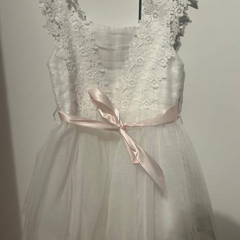 En kjole i vevd kvalitet med overdel i blonde, holkermer med bølgekant og dyp utringning bak med perlemorskimrende knapper. Søm i midjen og skjørt i doble lag tyll.