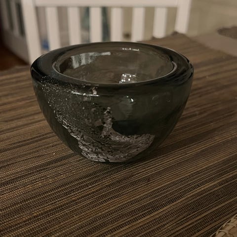 Dekorbolle i glass. Bollen er rund og laget i svart glass med lyst, ornamentert bladmønster på utsiden og innsiden. Egner seg som dekorasjon på bord eller hylle, for eksempel med telys, små gjenstander eller som enkel pyntegjenstand i interiøret.