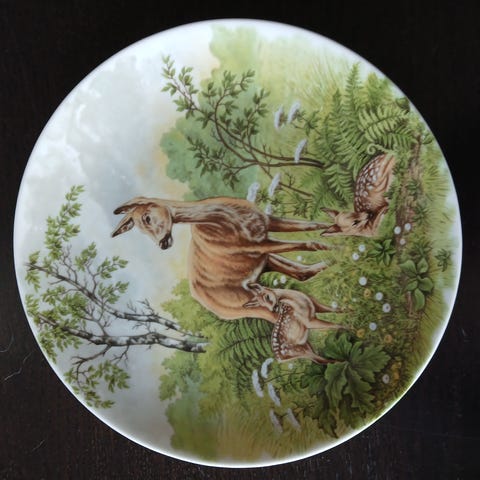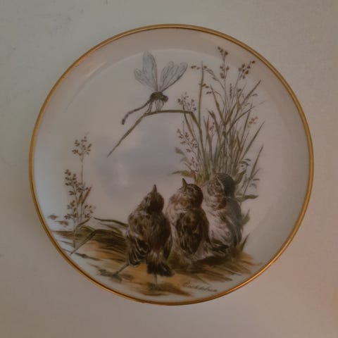 Håndmalt porselensplate fra Goebel, Vest-Tyskland. Dette er første utgave i den populære Mothers Series fra 1975, og motivet viser en morhare med sine unger i d