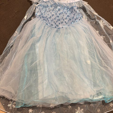 Elsa-kjole str. 110/116. Dessverre revnet litt nederst på kanten, men ellers pent brukt og har mye bruk igjen.