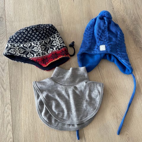 *en bacalava fra Reflex-fleece inni, ull på utsiden, en ull-lue fra Name it og en lue fra Reima i bomull.