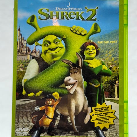 DreamWorks Shrek DVD med bonusmateriale. Inneholder filmen Shrek med engelske og danske språkvalg, samt undertekster på flere språk. DVD-en leveres i grønn plastkassett.