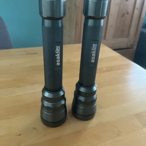 KRAFTIG oppladbar LED lommelykt med etui og lader. Lommelykten har digitalt display og betjeningsknapper på siden, beskyttelsesetui.