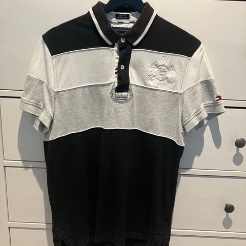 Tommy Hilfiger Classic Fit pique poloskjorte for herre i størrelse L. Skjorten er laget av bomull og har hvit bunnfarge med brede, mørke horisontale striper. Klassisk polo med krage og knappestolpe. Passer til hverdagsbruk og fritid, og kan kombineres med både jeans, chinos og shorts.