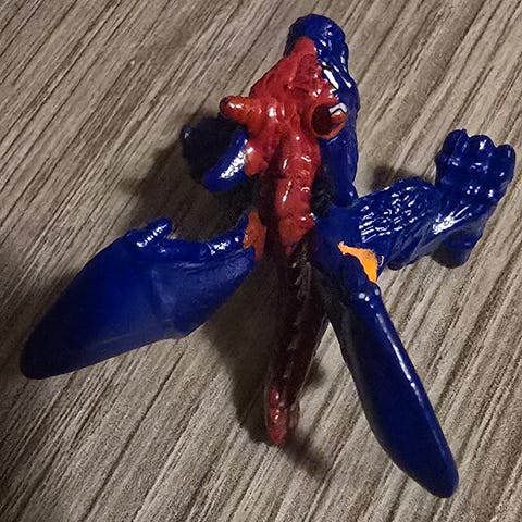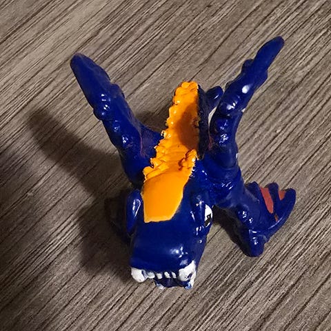 Beskrivelse: En liten, lilla eller mørkeblå drage-lignende figur med oransje vinger. Tallet "398" under foten er figurens samlernummer.