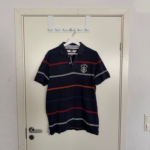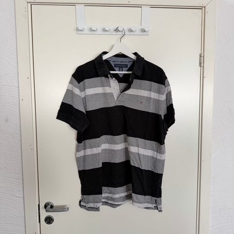 Tommy Hilfiger poloskjorte for herre i størrelse L. Skjorten er grå med horisontale striper og klassisk krage med knappestolpe. Materialet er bomull, som gir et mykt og behagelig plagg til hverdagsbruk. Passer til uformelle anledninger og kan kombineres med både jeans, chinos og shorts.