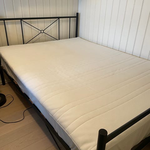 Selger en komplett seng. Usikker hvor den er i fra. Overmadrassen er ca. 1 år gammel, veldig myk og god. Det har dessverre blitt sølt brus på overmadrassen, noe som har gitt en litt større flekk. Trekket kan tas av og vaskes i vaskemaskin (Har ikke fått gjort det selv). Selvfølgelig litt «bruksmerker», utover det er sengen i god stand. Ingen dyr eller røyk.