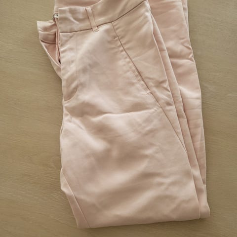 KappAhl bukse for dame i størrelse 38. Buksen er laget i polyester og har en smal passform med full lengde. Fargen fremstår som bugunderrød. Egner seg til hverdagsbruk eller jobb, og kan kombineres med både gensere og bluser. Materialet er lett og mykt, og gir god bevegelsesfrihet.