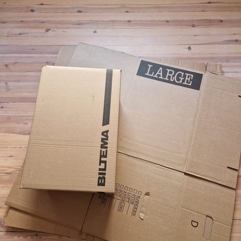 Tvangsarbeid flytteesker i brun papp. Eskene er laget i solid bølgepapp og egner seg til pakking og oppbevaring ved flytting eller lagring. Trykk på sidene viser veiledning for bretting og lukking av eskene. Passer til generell bruk i hjem, kontor eller lager der det er behov for transport og oppbevaring av innbo og løsøre.