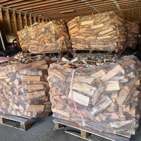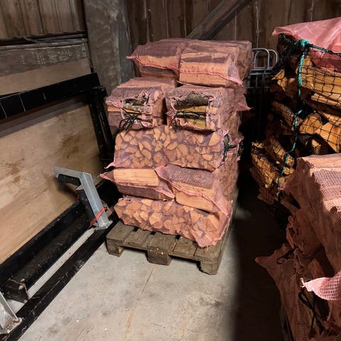 40 sekker med tørr blandingsved til salgs. For det meste furu og gran. Sekkene er 40 liter
