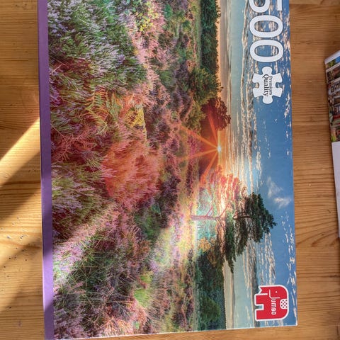 Jigsaw Puzzle puslespill med motiv av regnbue, skyer og lys. Puslespillet leveres i eske som vist på bildet. Antall brikker og mål på ferdig puslespill er ikke oppgitt på emballasjen. Egnet som aktivitet for én eller flere personer som liker puslespill med fargerikt naturmotiv. 1000 brikker